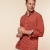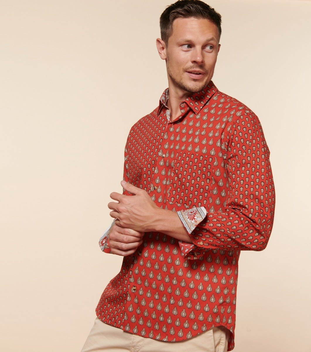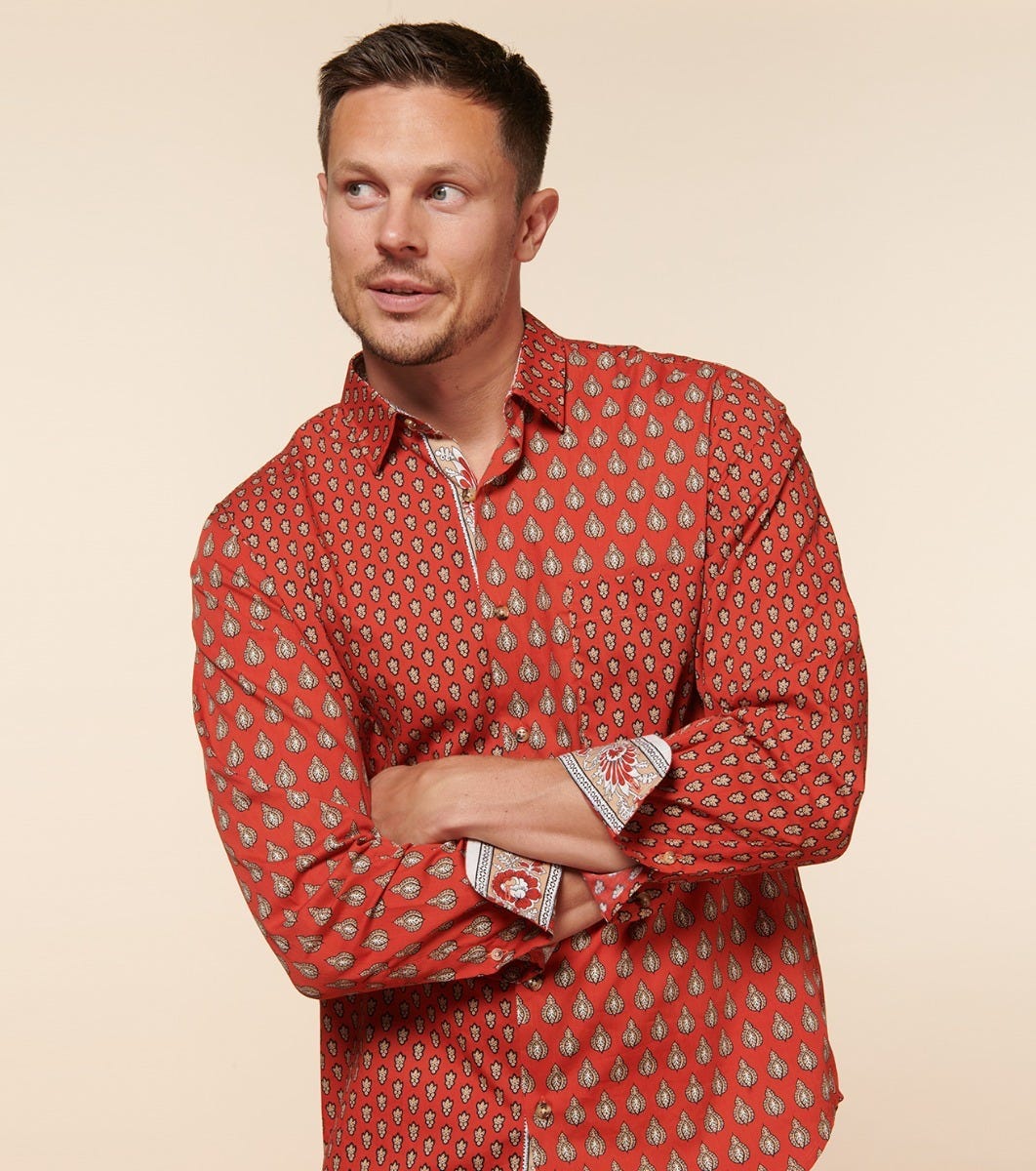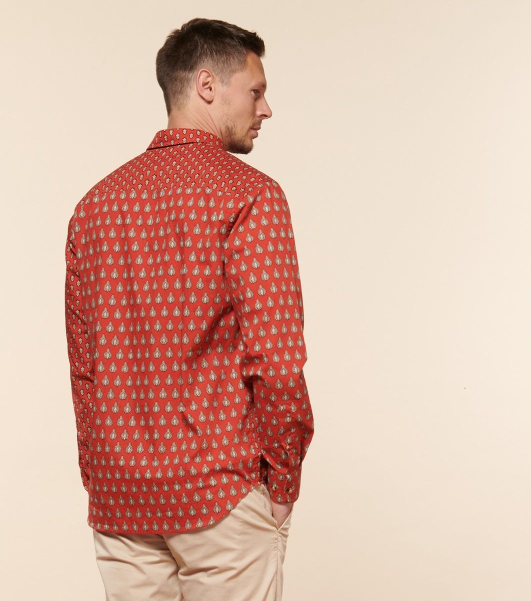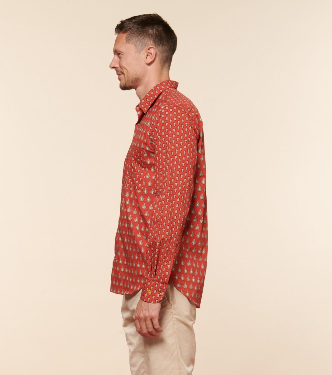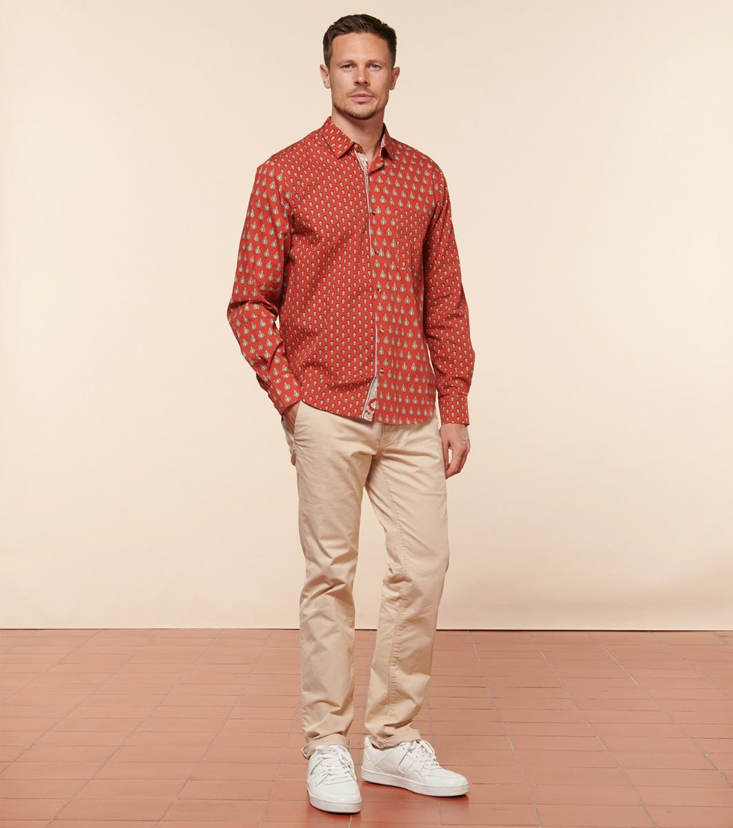 - Dark orange “Le Petit Artichaud” printed frieze detail on inside contrast at collar stand, under collar and inside cuff