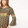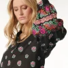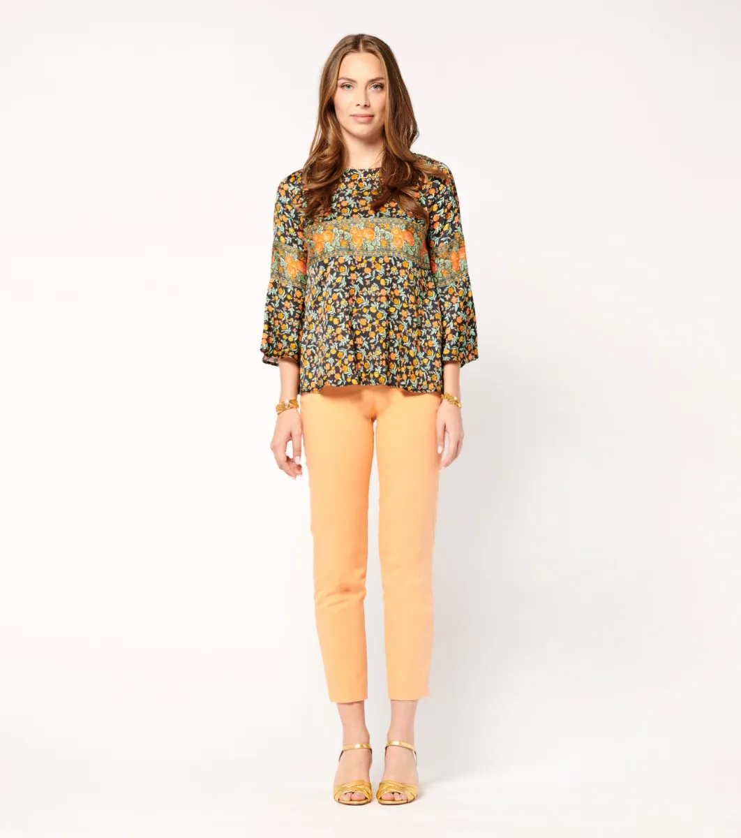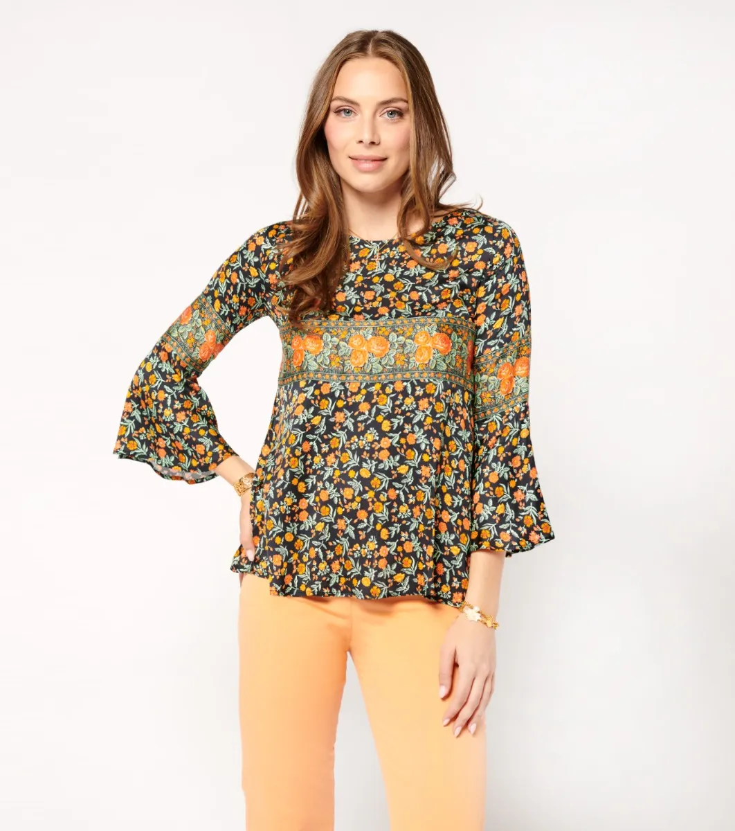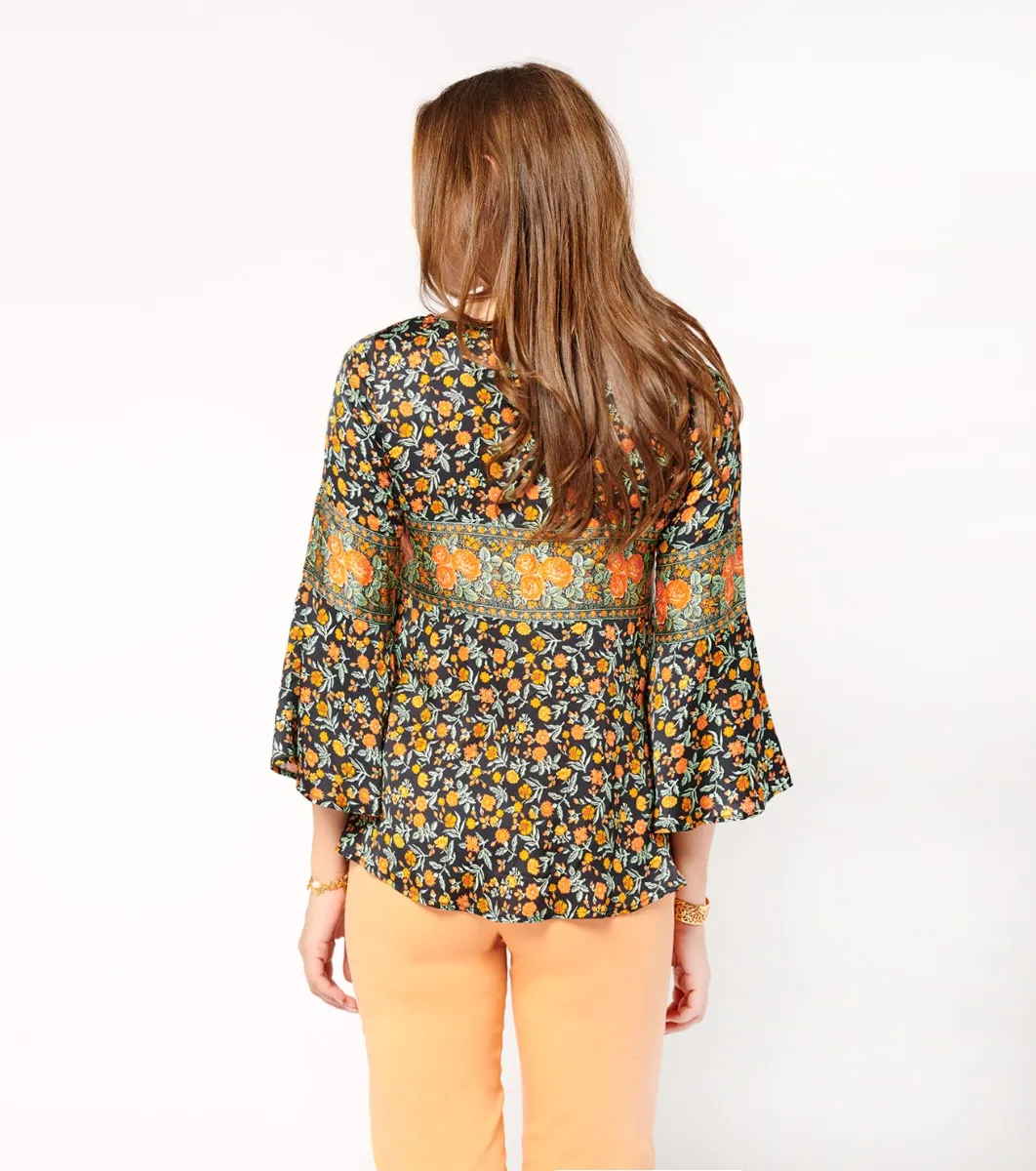 - Bel fiore black orange” decorative frieze detail on front, back and sleeves