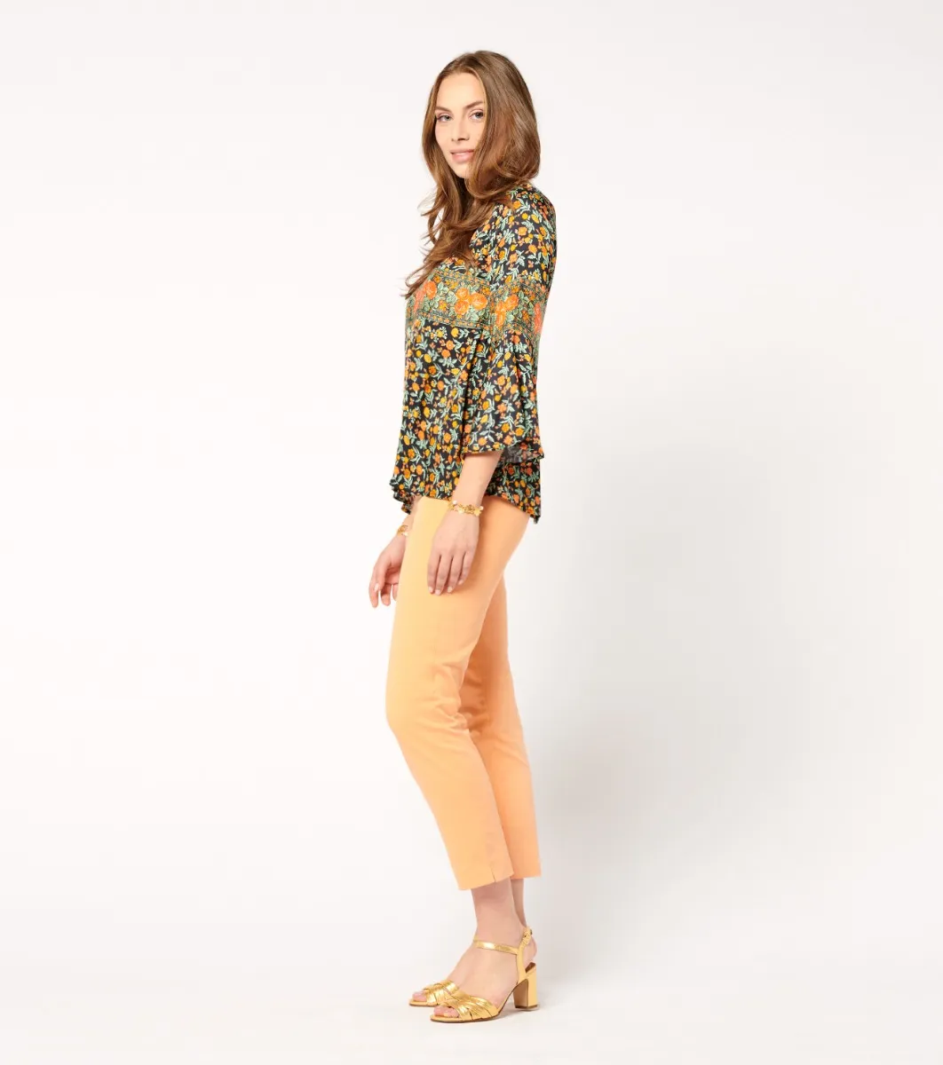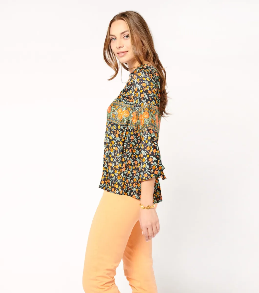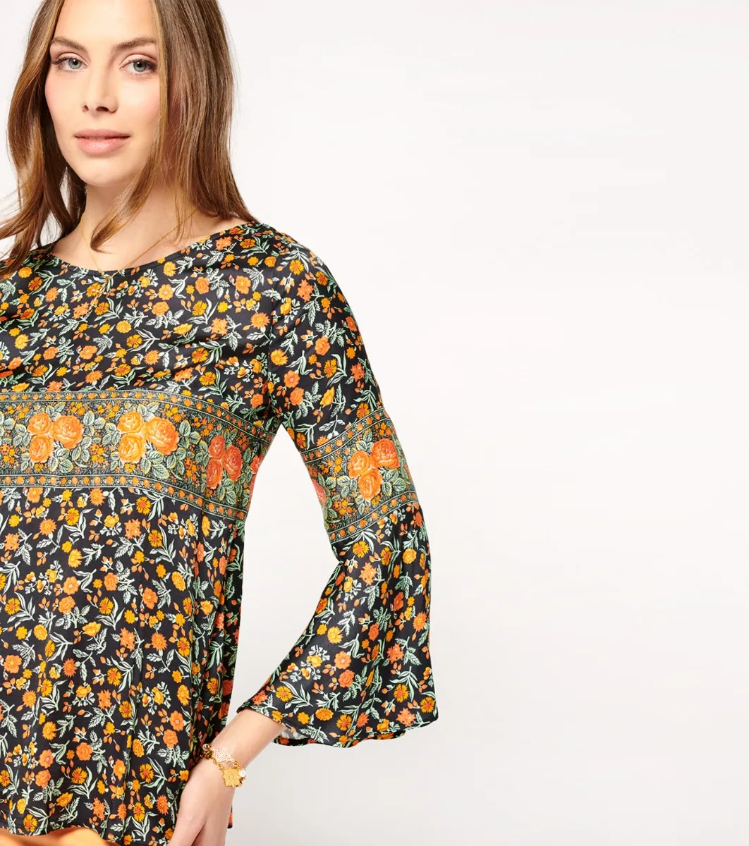 - A blouse with a bohemian chic spirit, its fluid, slightly satiny fabric gives it all its elegance and femininity.