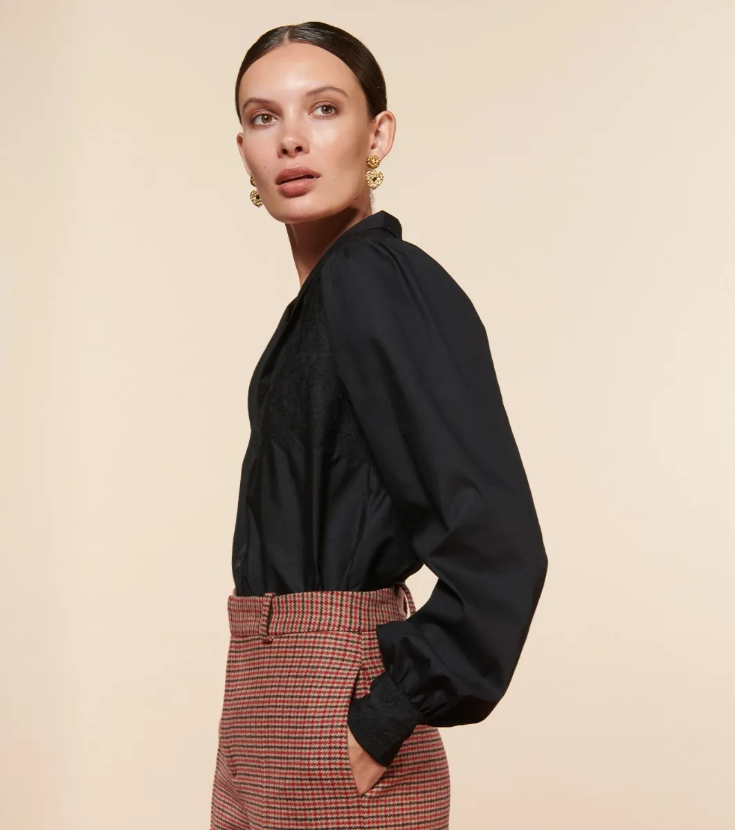 - Embroidered cuffs fastened with 4 beautifully designed black metal buttons