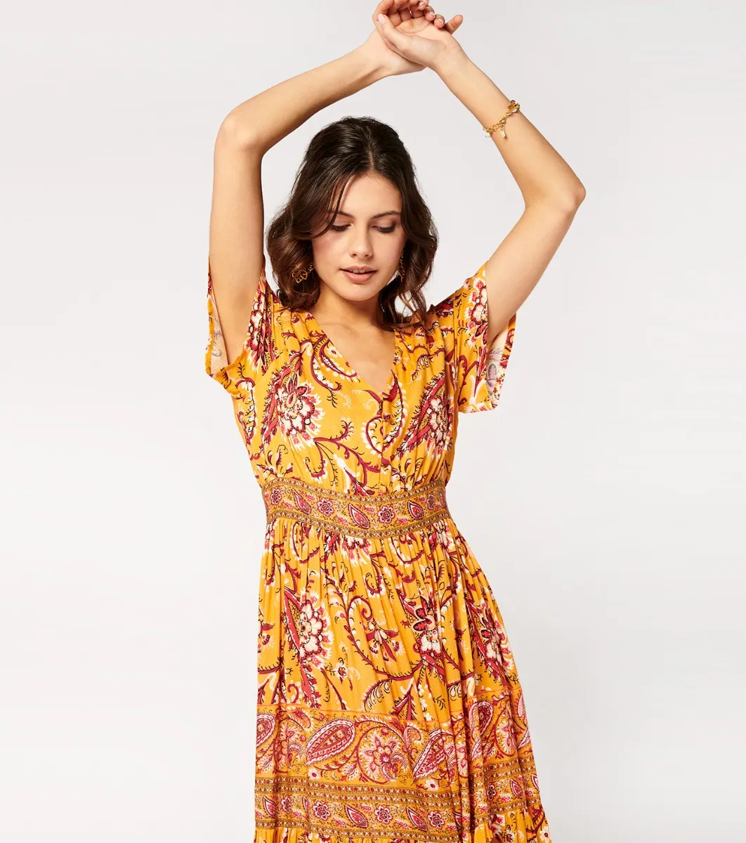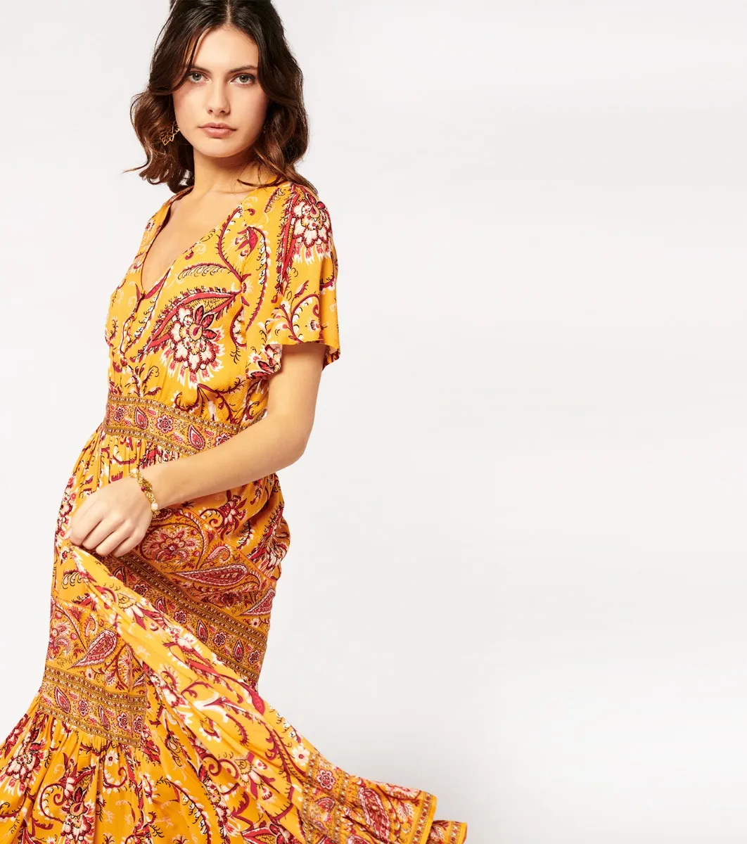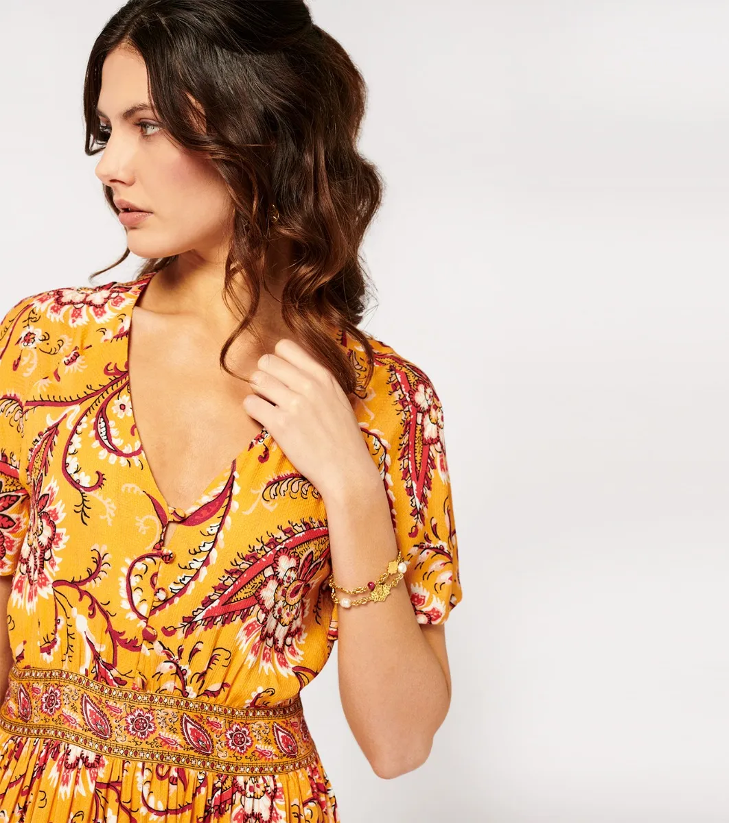 - Catalina, combines elegance and comfort with a fitted body and V-neckline subtly embellished with covered buttons. The gathered ruffled hemline, embellished with printed braids, adds movement and style. With its bohemian-style cut and fluid, lightweight fabric, this dress is ideal for a look that’s both chic and casual.