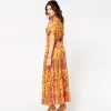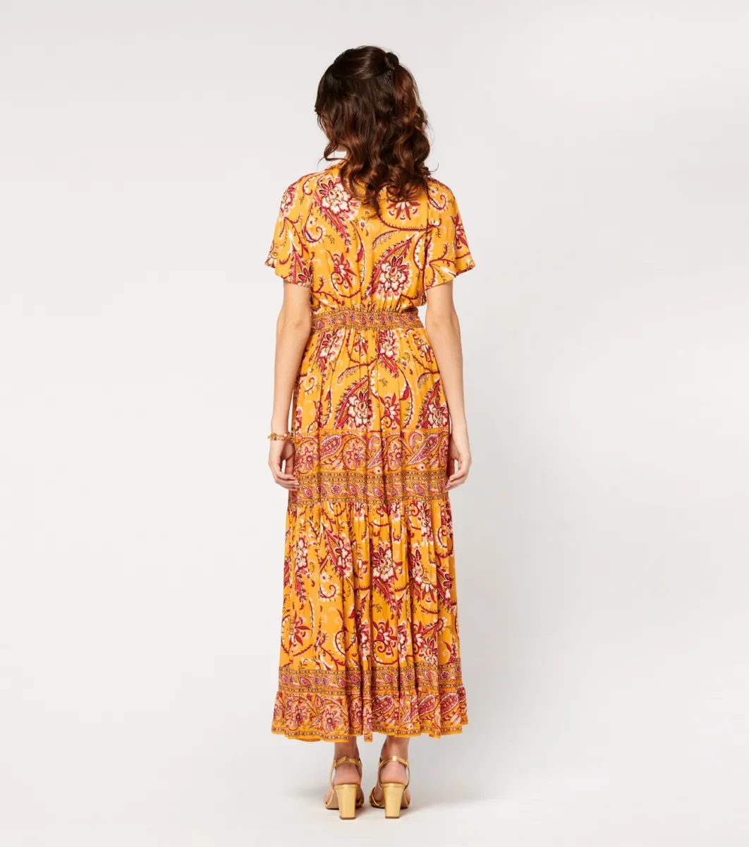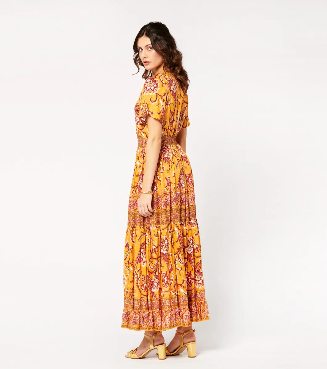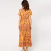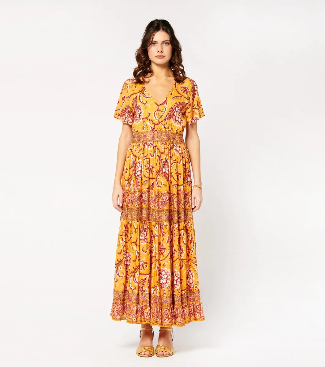 - Catalina, combines elegance and comfort with a fitted body and V-neckline subtly embellished with covered buttons. The gathered ruffled hemline, embellished with printed braids, adds movement and style. With its bohemian-style cut and fluid, lightweight fabric, this dress is ideal for a look that’s both chic and casual.