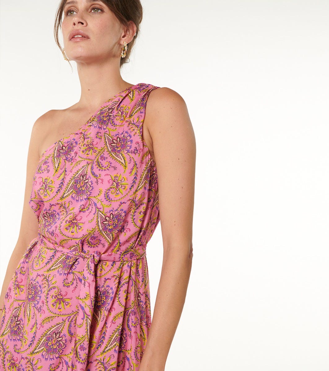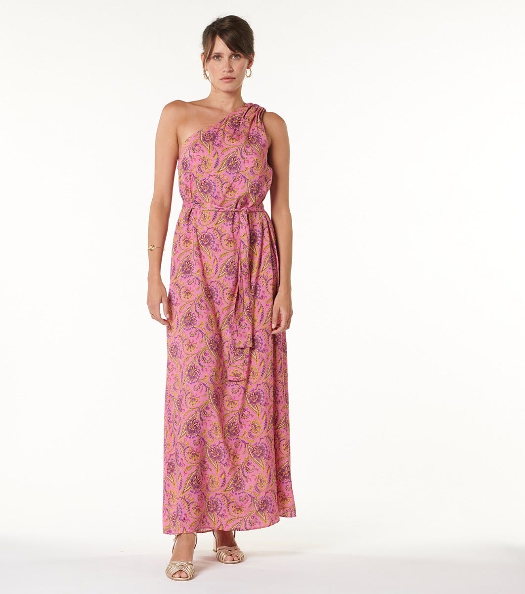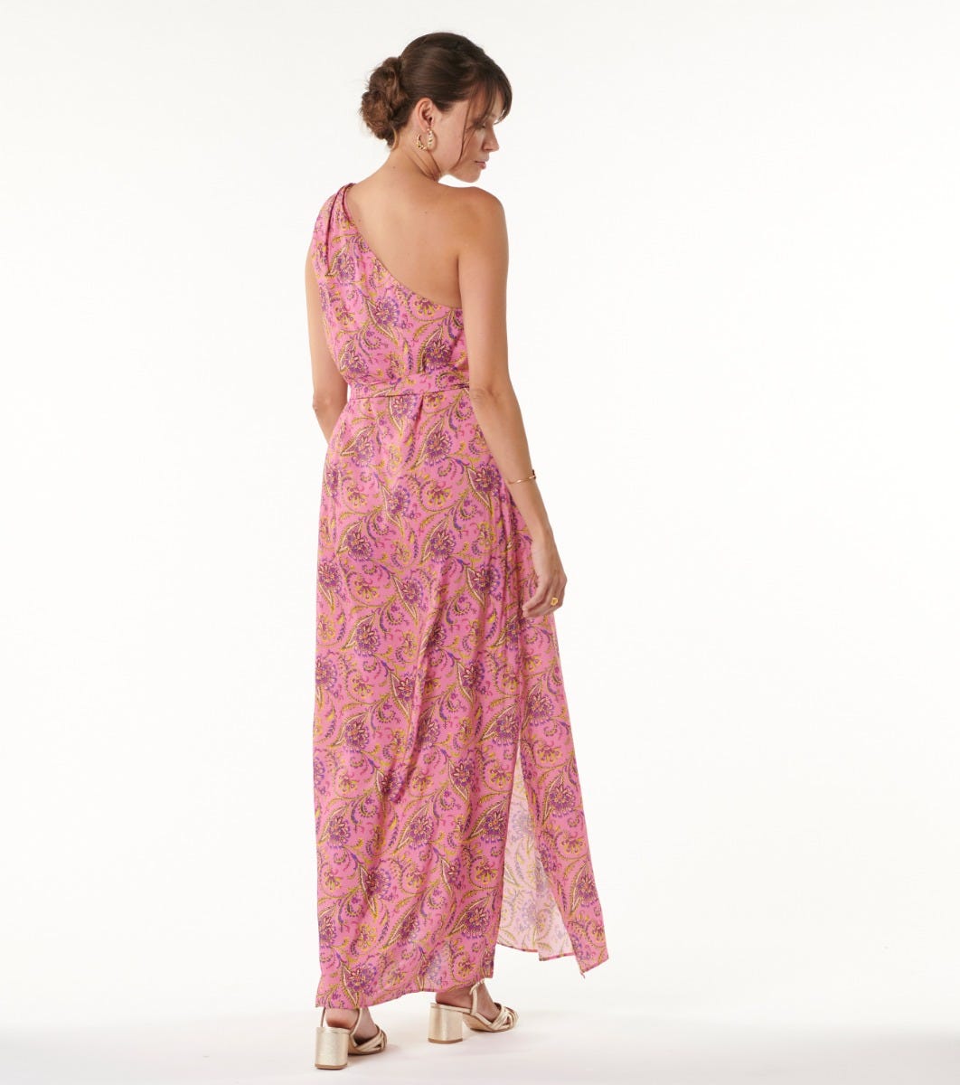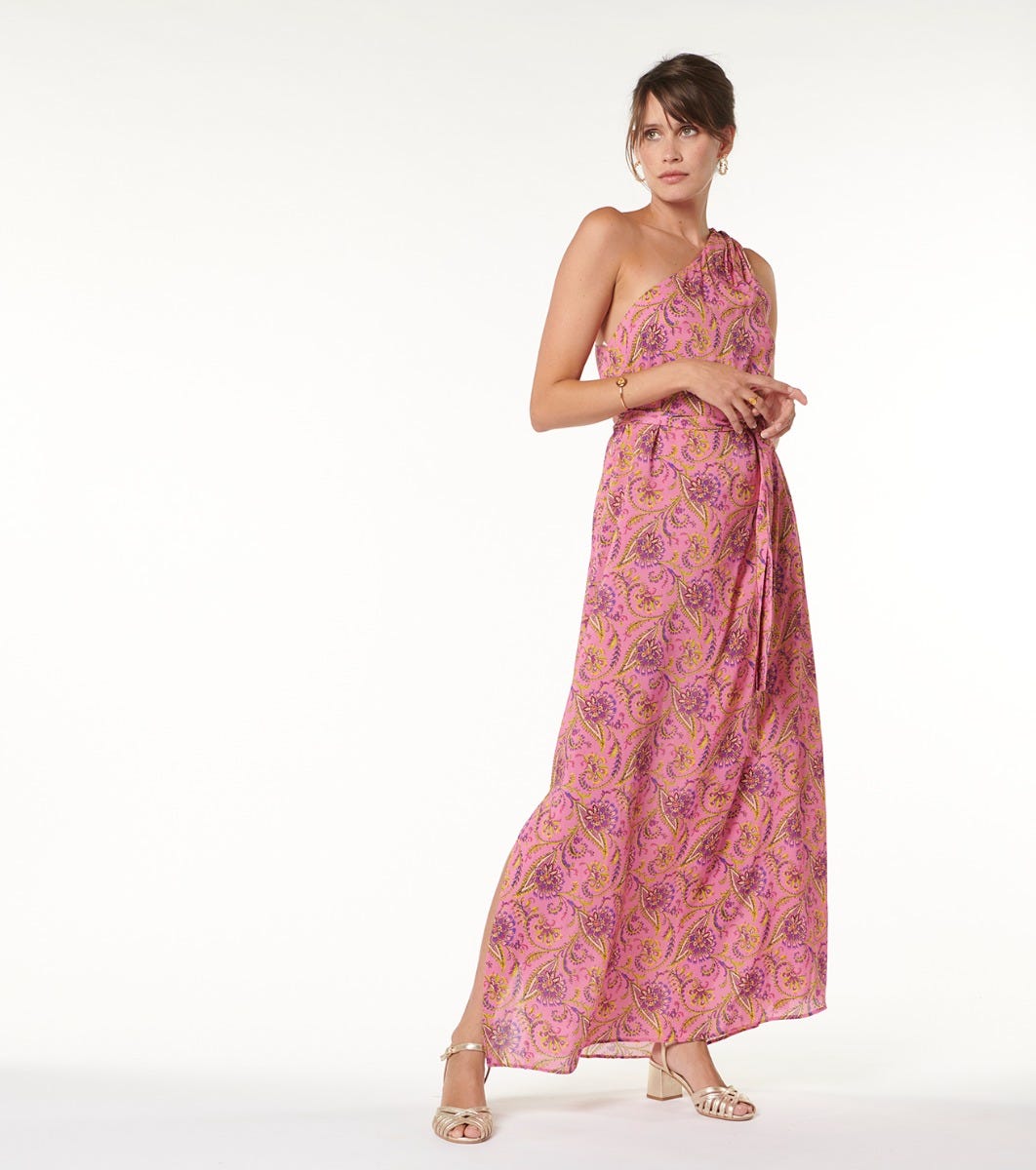 - Long dress with asymmetric neckline and bare shoulder