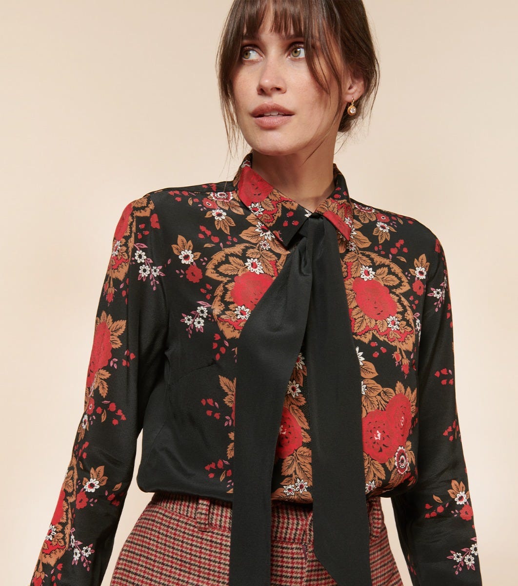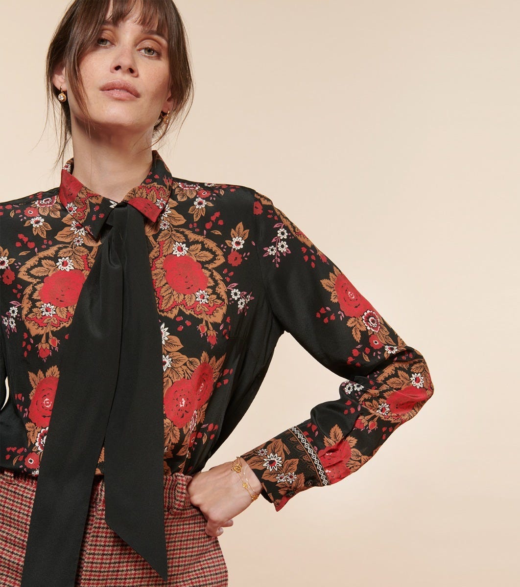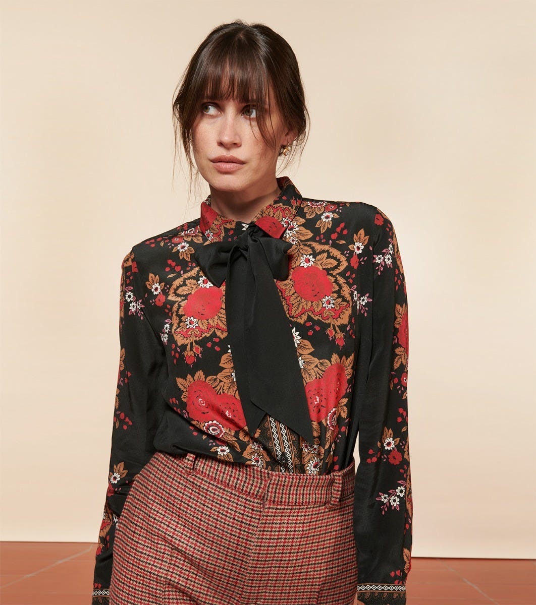 - A flowing silk blouse, the print is placed on the blouse as if it had been assembled from scarves. Its lavaliere collar gives it a sophisticated look.