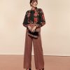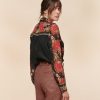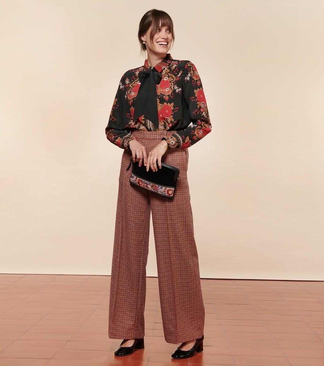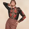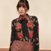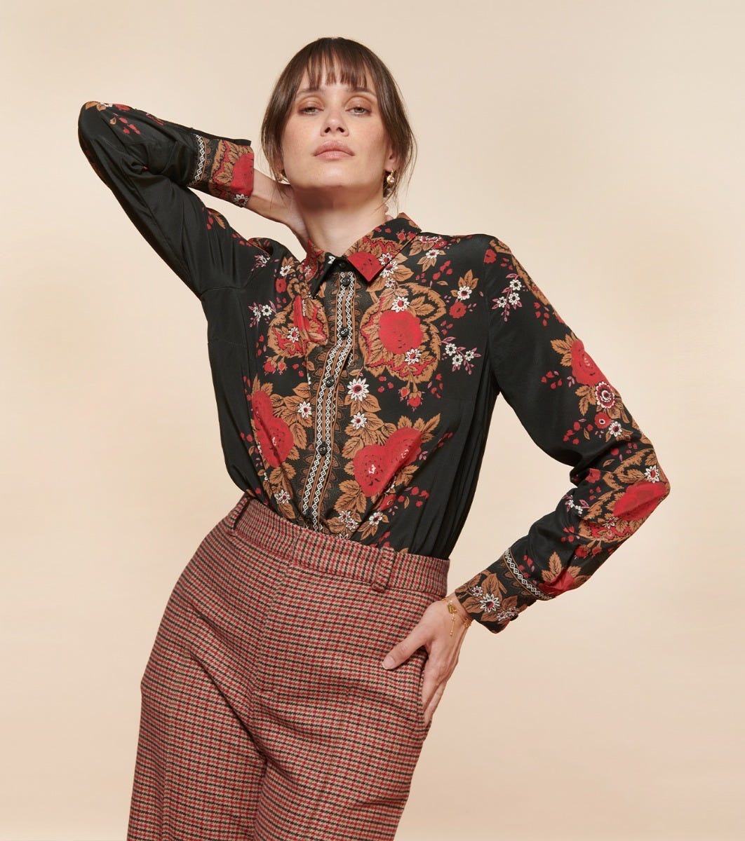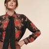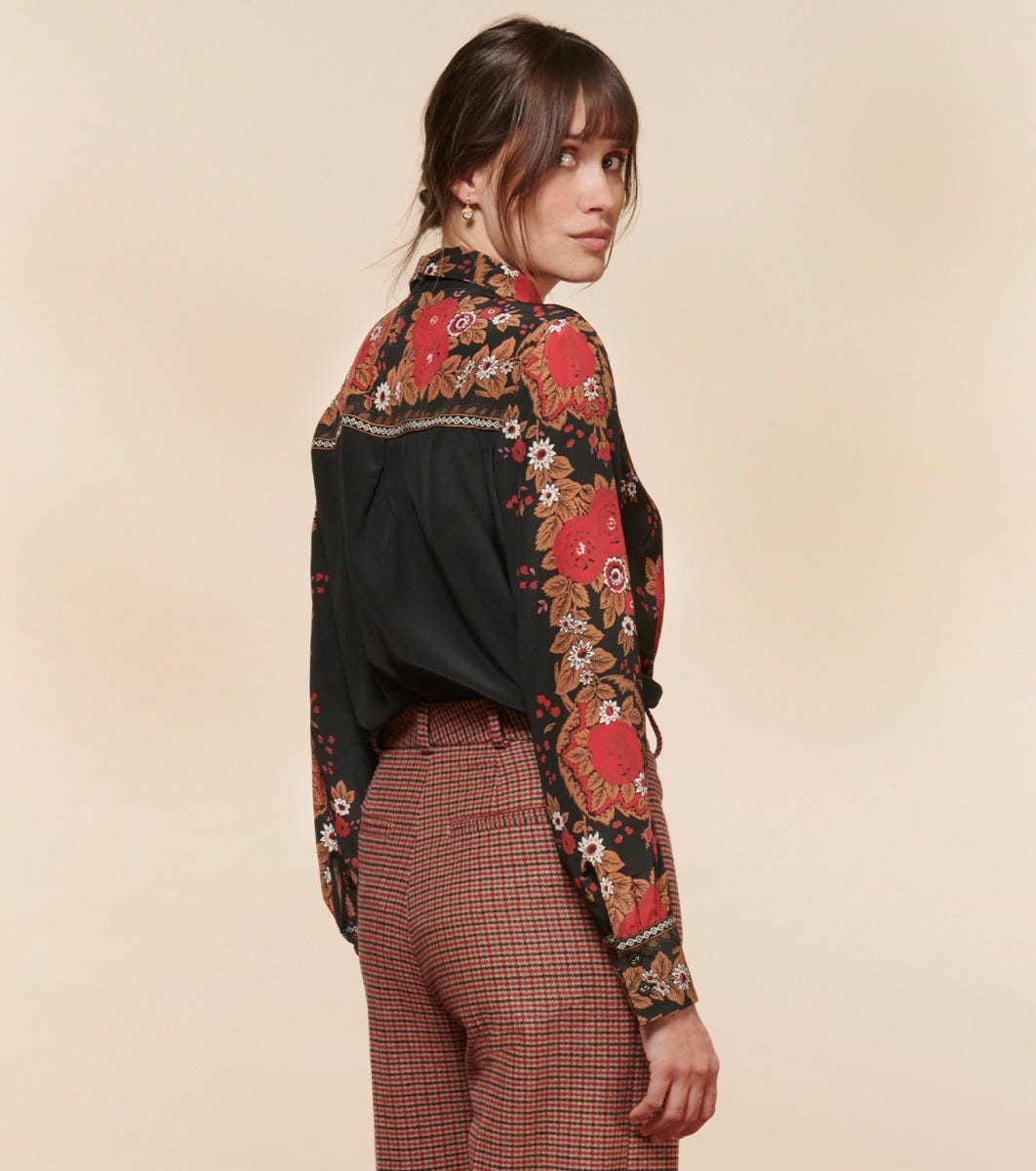 - A flowing silk blouse, the print is placed on the blouse as if it had been assembled from scarves. Its lavaliere collar gives it a sophisticated look.