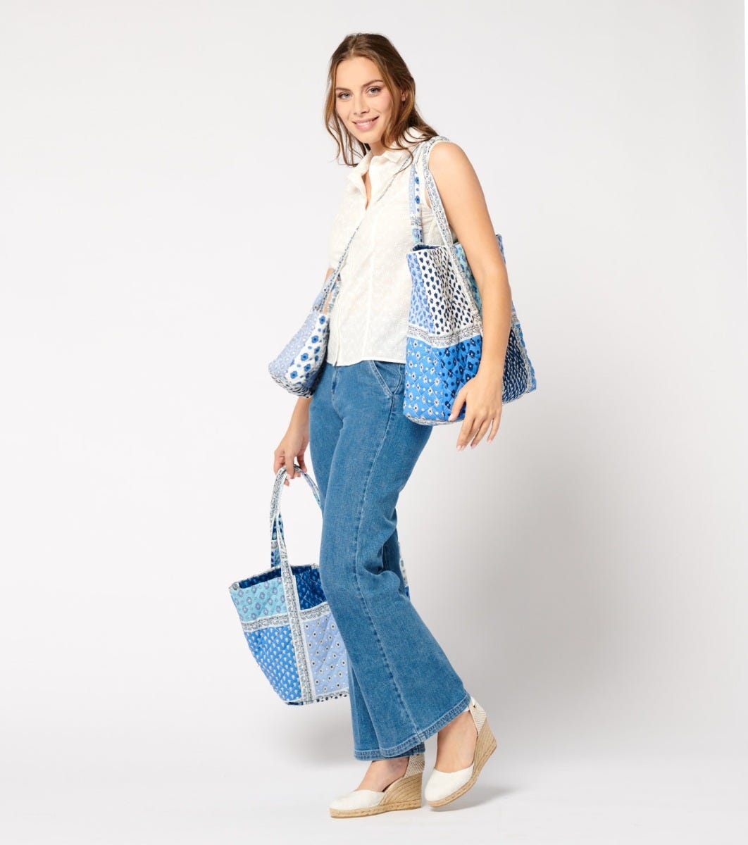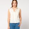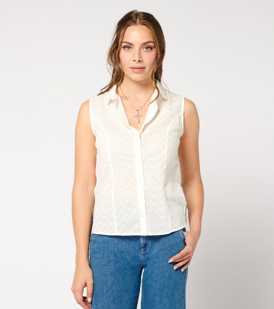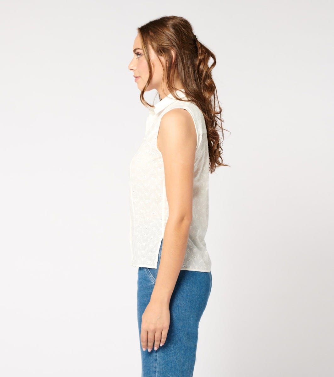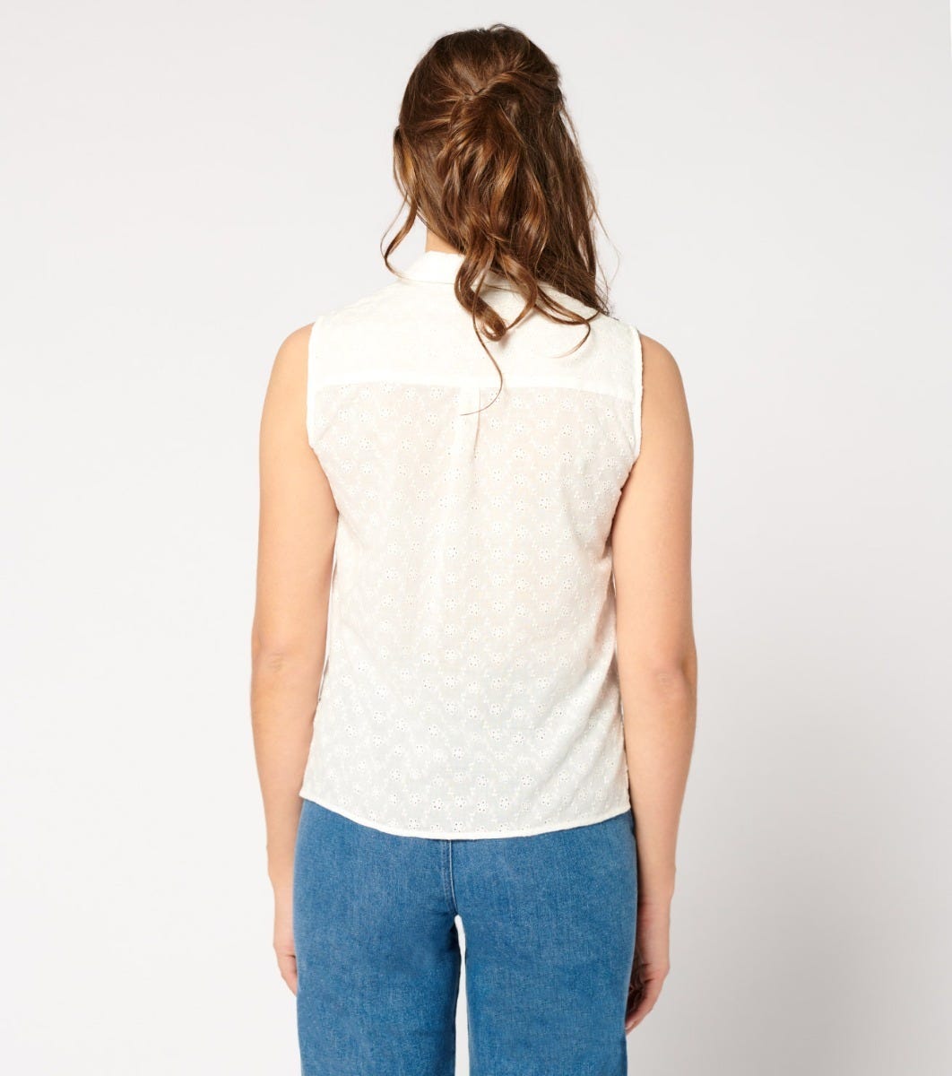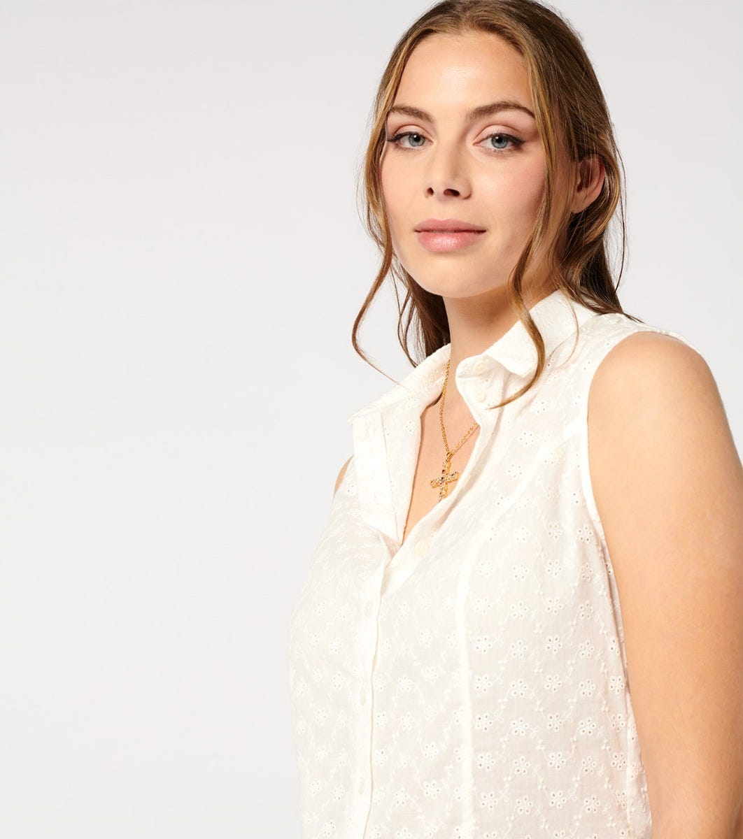 - Top with American armholes and refined shirt collar. Its button placket adorned with mother-of-pearl buttons adds a touch of elegance to this light, feminine piece.